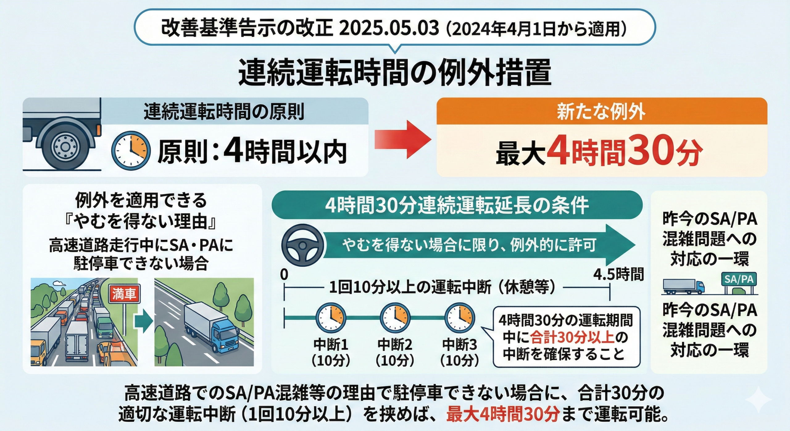 その主な改正点の一つである連続運転時間については、原則(4時間以内)は維持しつつ、新たな例外措置が設けられました。具体的には、サービスエリア(SA)やパーキングエリア(PA)等に駐停車できないといったやむを得ない理由がある場合に限り、連続運転時間が4時間を超えても、最大4時間30分まで運転を継続することが認められます。